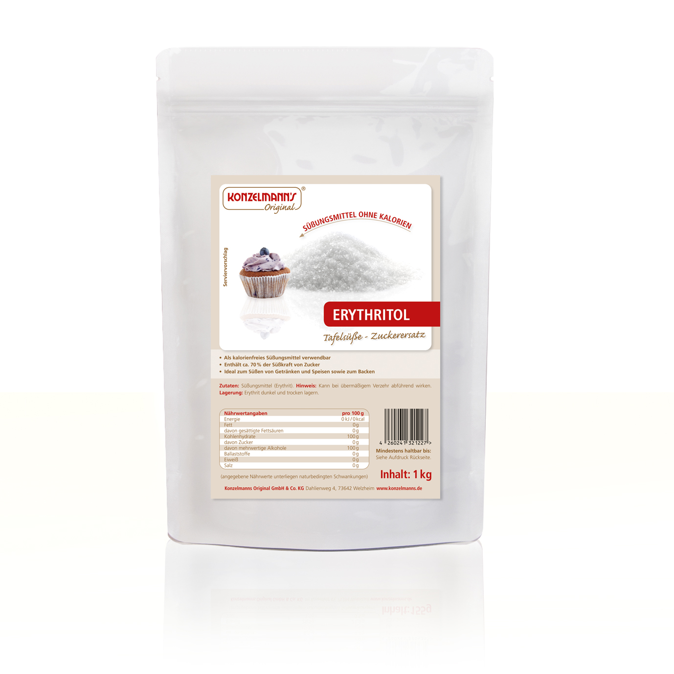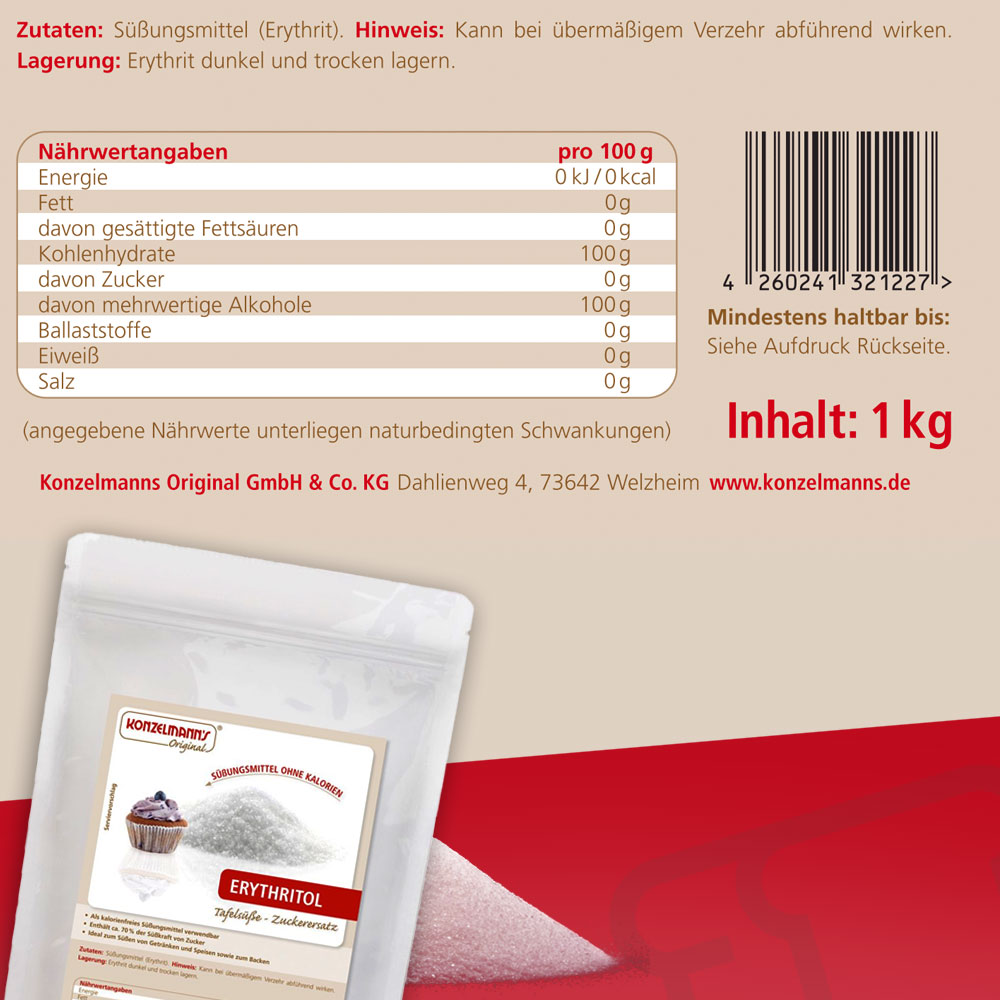 Süßer Genuss ohne Kalorien? Erythrit macht das möglich. Der Zuckerersatzstoff ist in aller Munde und schmeckt dabei noch herrlich süß. Erythrit ist für alle eine echte Alternative, die in ihrem Alltag auf Zucker verzichten wollen. Es eignet sich ideal zum Backen oder zum Süßen von anderen Lebensmitteln. Dabei ist Erythrit überaus zahnfreundlich und vielseitig einsetzbar. Ob in seiner Reinform für Backwaren oder gemahlen als Puderzucker-Ersatz: mit dem Erythrit von Konzelmann’s Original bereichern Sie die heimische, kohlenhydratreduzierte Küche.